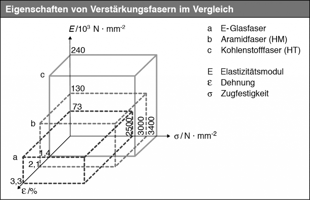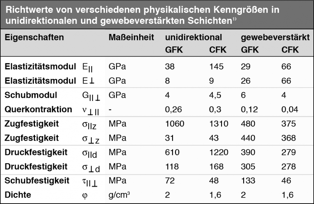 Für die Berechnung des elastischen Verhaltens konventioneller Werkstoffe (= isotroper Werkstoffe) sind in der Regel Elastizitätsmodul (E), Schubmodul (G) und Querkontraktionszahl (n) ausreichend. Bei Faserverbundwerkstoffen (= anisotrope Werkstoffe) benötigt man hingegen vier unabhängige Größen: da sich in Längs- und Querrichtung unterschiedliche Werte ergeben.